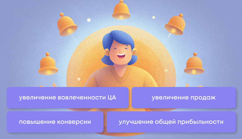 | Повышение конверсии и продаж | Получается привлечь пользователей к конкретным действиям. Например, совершить покупку. Это увеличивает конверсии и продаж. |