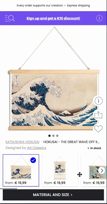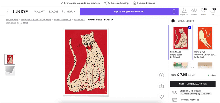 - Предпросмотр товара: Внедрение возможность выбора размера и материала постера прямо на странице товара. Для каждой опции добавили возможность предпросмотра финальной версии товара.